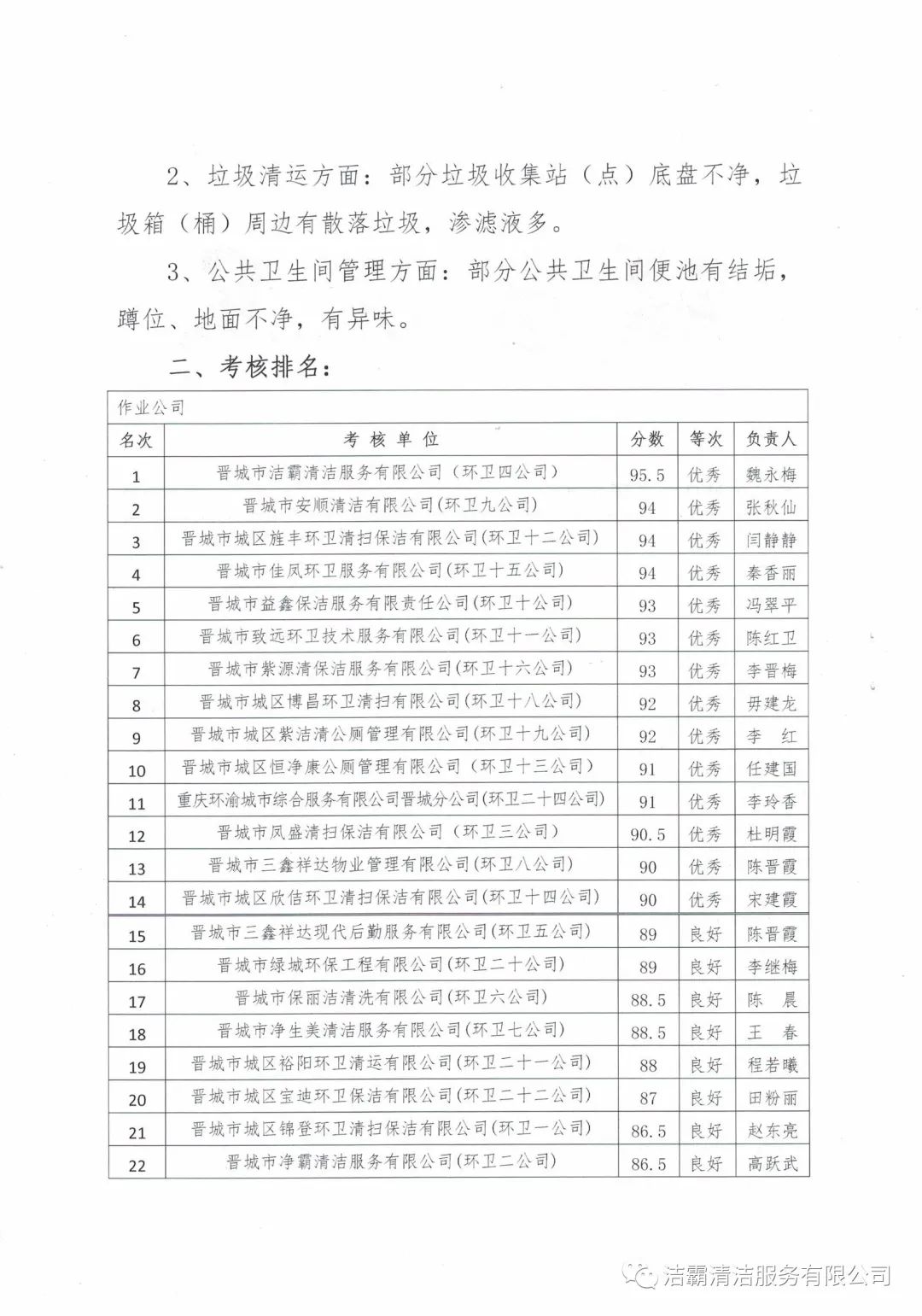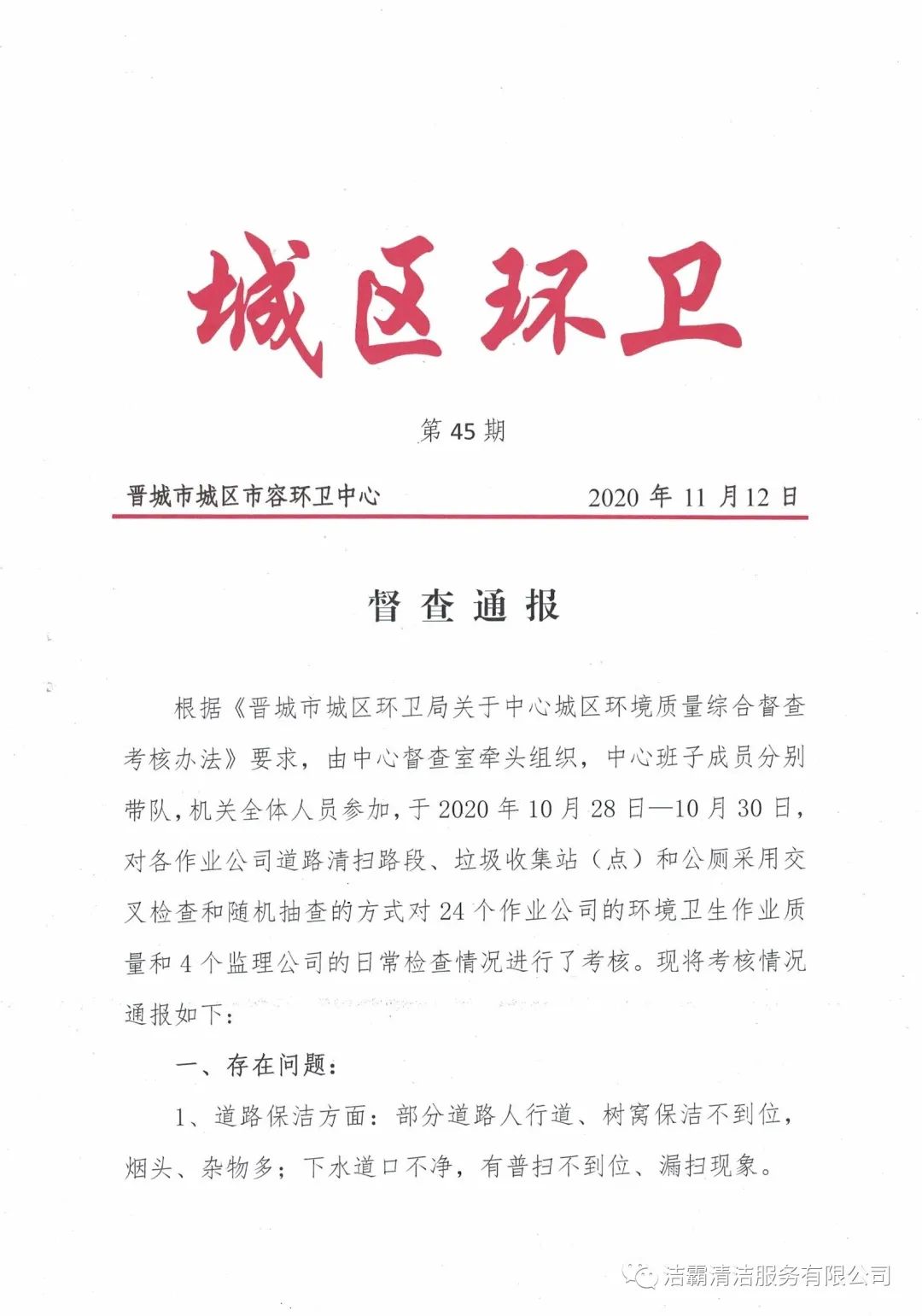 2020年10月28日—10月30日,晉城市城區(qū)市容環(huán)衛(wèi)中心由中心督查室牽頭組織,中心班子成員分別帶隊,機關全體人員參加,對各作業(yè)公司道路清掃路段、垃圾收集站(點)和公廁采用交叉檢查和隨機抽查的方式對24個作業(yè)公司的環(huán)境衛(wèi)生作業(yè)質量和4個監(jiān)理公司的日常檢查情況進行了考核。晉城市潔霸清潔服務股份有限公司所屬的環(huán)衛(wèi)四公司分數最高,名列第一。