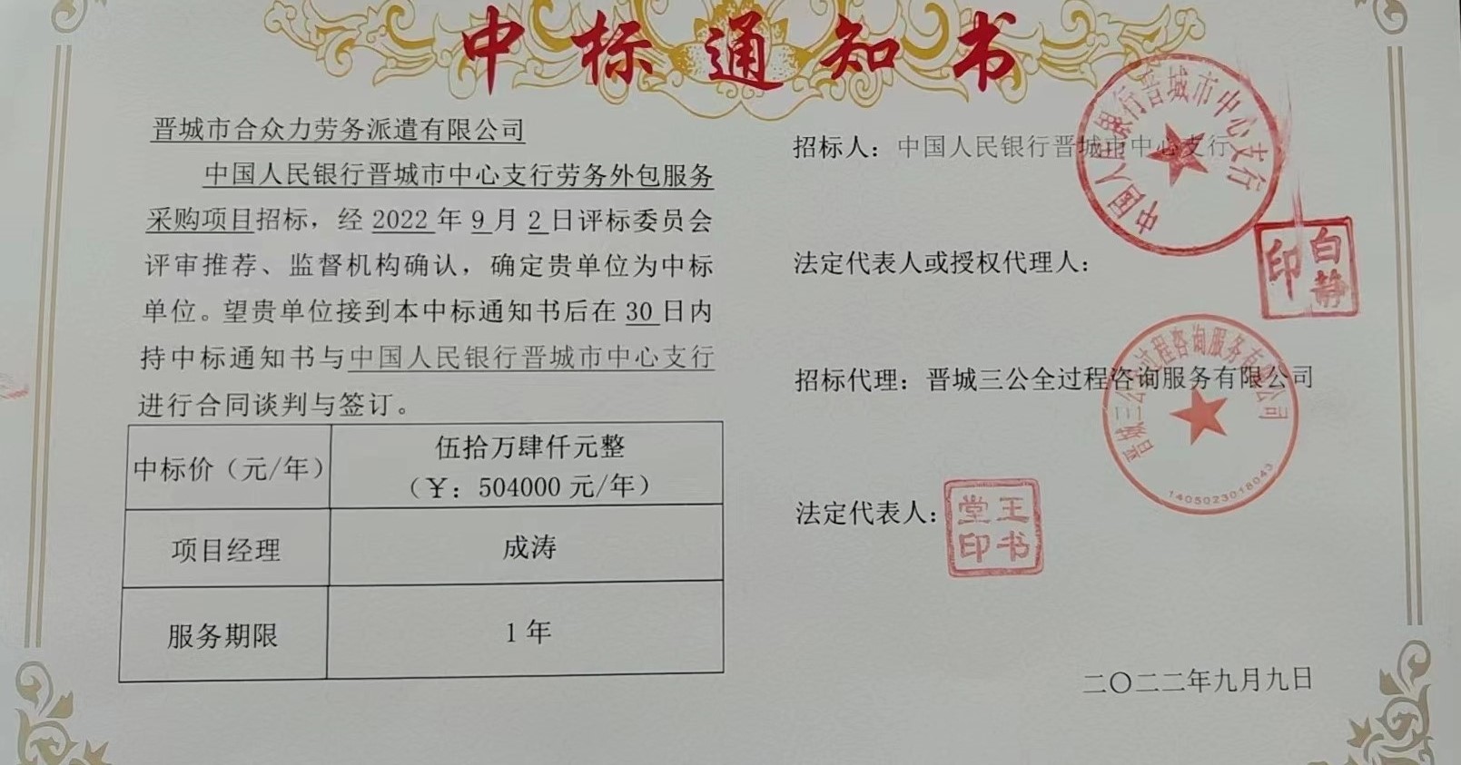 近日,晉城市合眾力勞務(wù)派遣有限公司收到《中標(biāo)通知書(shū)》,確定公司為中國(guó)人民銀行晉城市中心支行勞務(wù)外包服務(wù)采購(gòu)項(xiàng)目的中標(biāo)人,中標(biāo)金額504000元。
