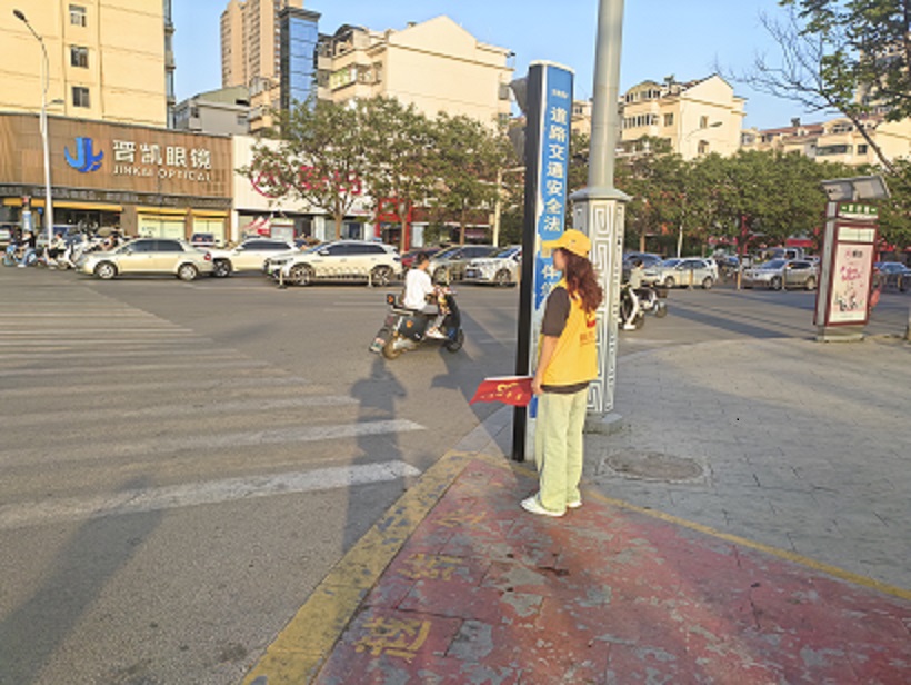活動(dòng)中,支部黨員、入黨積極分子志愿者身穿志愿者馬甲,手持文明勸導(dǎo)旗子,化身為“交通安全守護(hù)員”。她們站在斑馬線兩側(cè),對(duì)行人闖紅燈、橫穿馬路、不走斑馬線等不文明行為進(jìn)行勸阻,引導(dǎo)電動(dòng)車等非機(jī)動(dòng)車輛按信號(hào)燈指示行駛、不越線停車、不逆行,對(duì)非機(jī)動(dòng)車走機(jī)動(dòng)車道、闖紅燈、逆行、不戴頭盔等交通違法行為進(jìn)行勸導(dǎo)糾正,糾正制止不文明交通行為,宣傳勸導(dǎo)廣大市民遵守交通法規(guī)和規(guī)則,維護(hù)交通文明和社會(huì)秩序,自覺養(yǎng)成良好的文明交通習(xí)慣,時(shí)刻牢記遵法出行,確保自身及他人安全,共同營造平安、和諧、有序的道路交通環(huán)境。