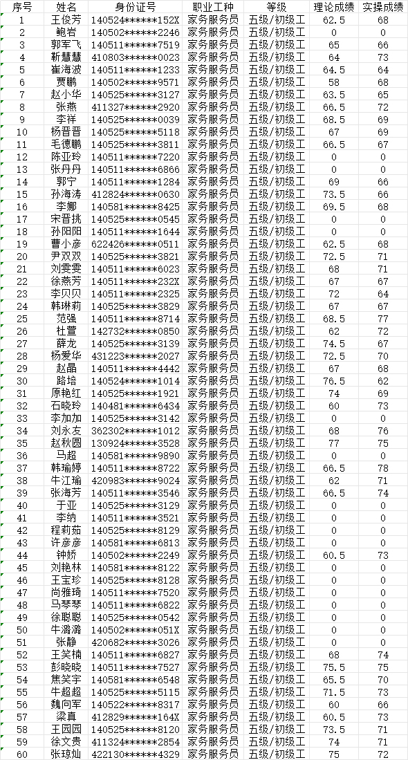 2024年7月7日第19批家政服務(wù)員初級認(rèn)定人員成績公示