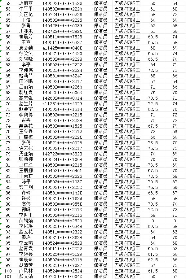 晉城市潔霸清潔服務(wù)股份有限公司職業(yè)技能等級認(rèn)定中心現(xiàn)將2024年7月28日認(rèn)定人員成績公示如下:
