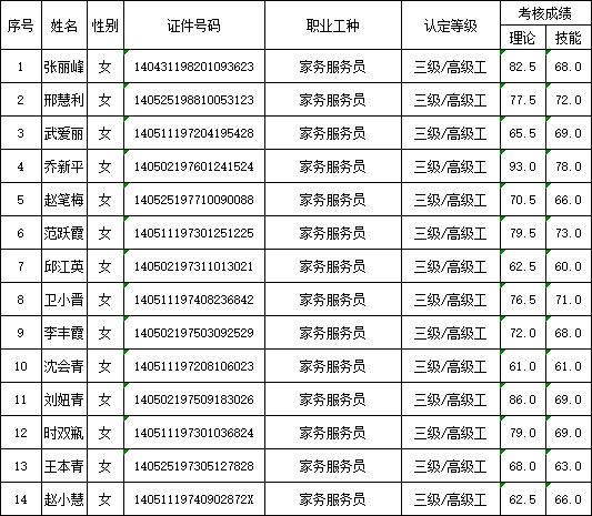 山西潔霸清潔服務(wù)集團(tuán)股份有限公司職業(yè)技能等級(jí)認(rèn)定中心現(xiàn)將2025年9月13日認(rèn)定人員成績公示如下: