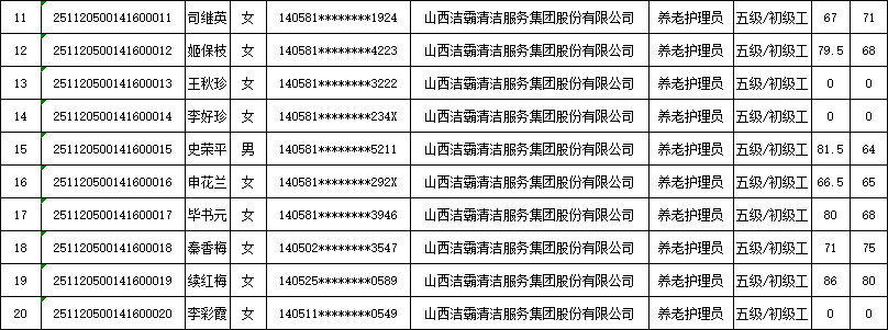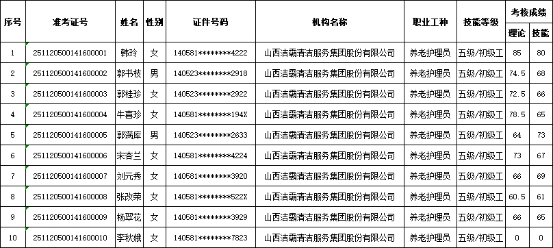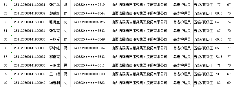 山西潔霸清潔服務(wù)集團(tuán)股份有限公司職業(yè)技能等級認(rèn)定中心現(xiàn)將2025年11月22日認(rèn)定人員成績公示如下: